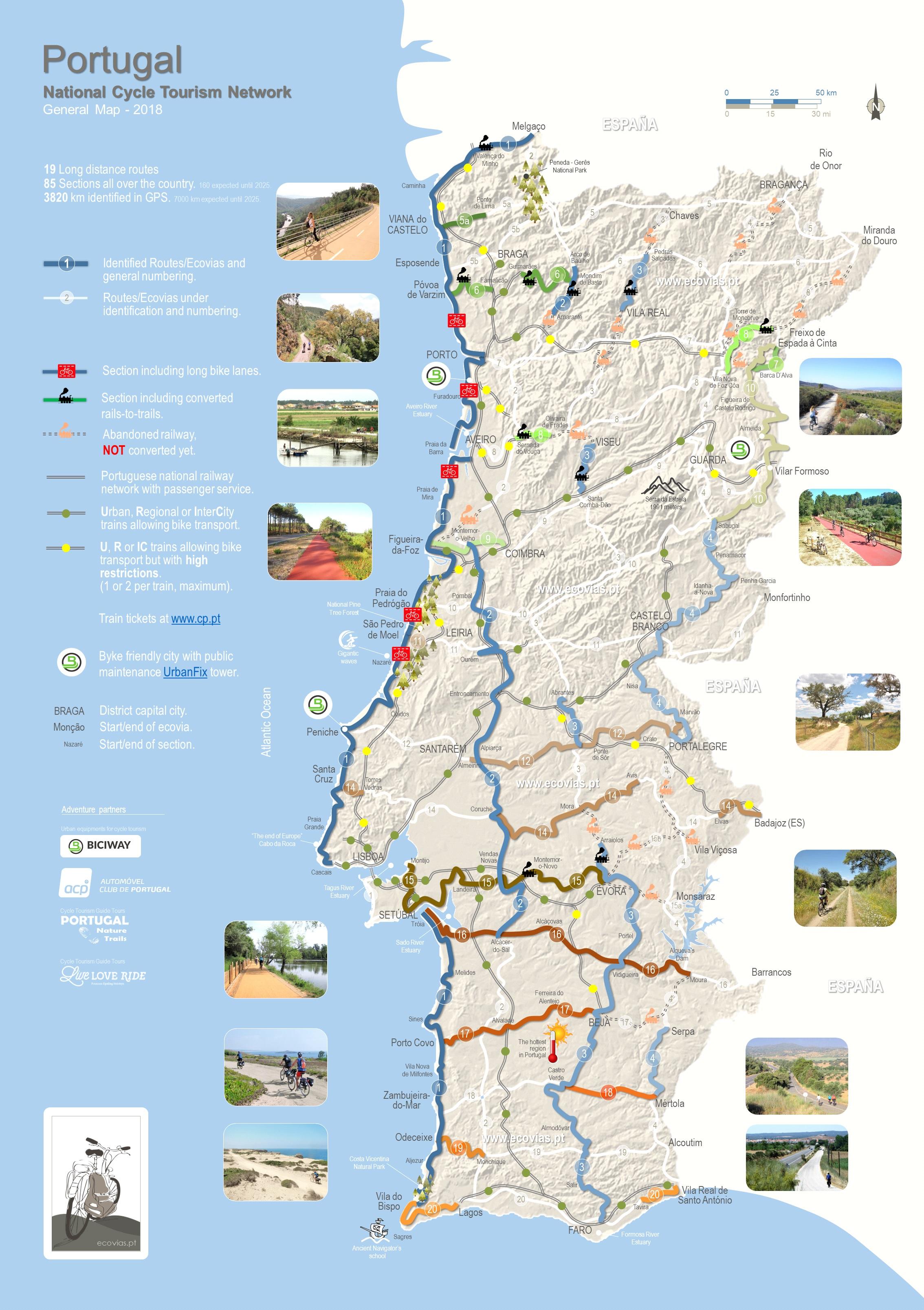 Er zijn steeds meer fietspaden in Portugal. Langs de kust, in natuurparken en bossen, en in de steden, zijn er veel bewegwijzerde fietsroutes, evenals servicepunten en specifieke winkels voor fietsers. Sommige hotels zijn ook uitgerust voor fietsers, met alle diensten die nodig zijn om uit te rusten en voor hun fiets, zodat alles altijd perfect werkt. Het is zelfs mogelijk om het fietsen te combineren met het openbaar vervoer, en zo uw mogelijkheden om het land te verkennen te vergroten. Ecovia Algarviana: Een 300 km lange route in de Algarve, ideaal voor toertochten in het zuiden van Portugal. Via Algarviana is een Grote Voetgangersroute (GR13) die Alcoutim met Cabo de São Vicente verbindt, met een lengte van 300km, grotendeels aangelegd in de Algarve zoals zijn vermeld in Portugal fietskaart. Het is de bedoeling dat deze route deel gaat uitmaken van de Trans-Europese routes en aansluit op de E4 en E9. De route doorkruist elf gemeenten in de Algarve (Alcoutim,Aljezur, Castro Marim, Tavira, S. Brás de Alportel, Loulé, Silves, Monchique, Lagos, Portimão en Vila do Bispo) en ongeveer 21 parochiebesturen.
